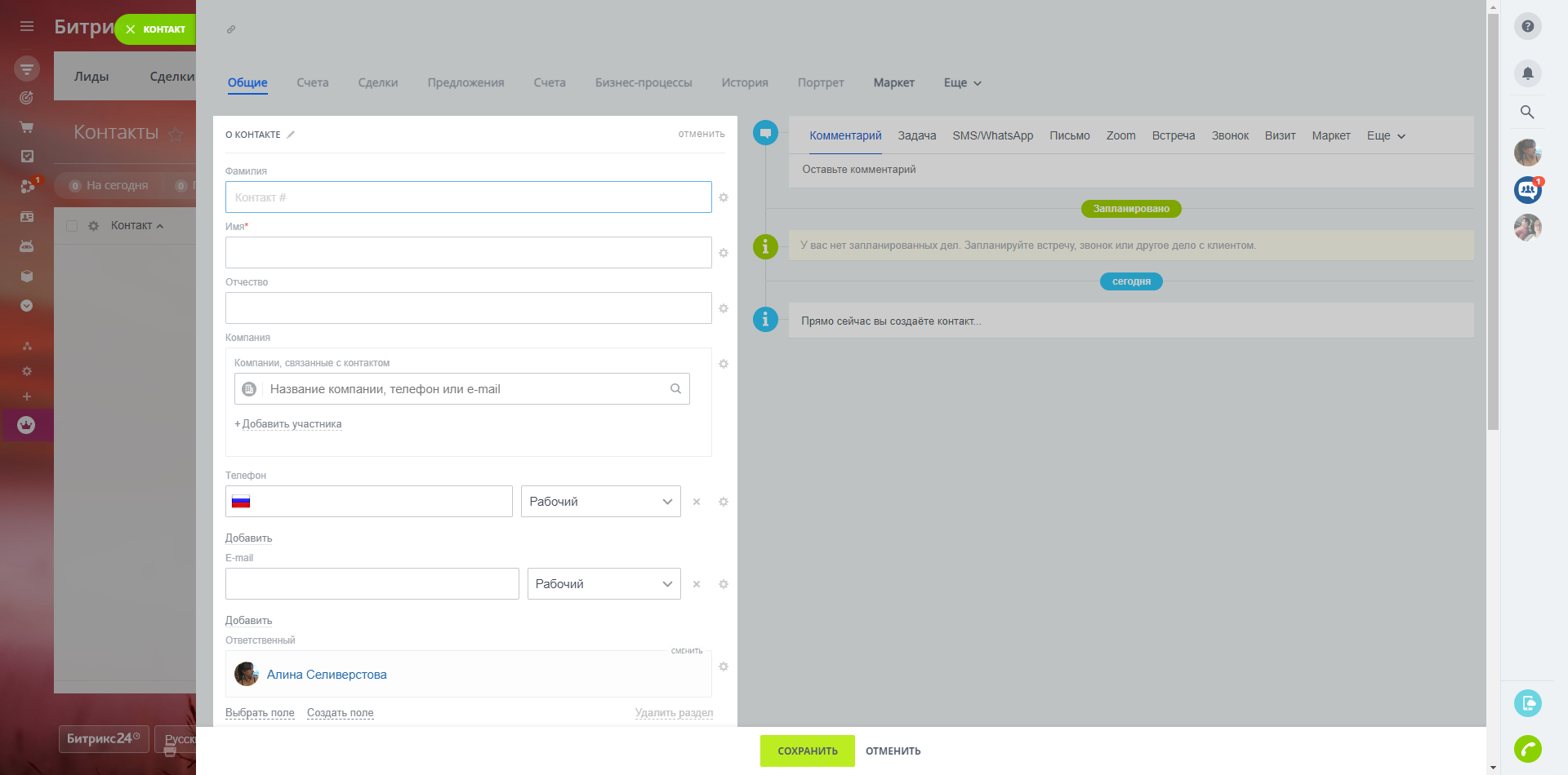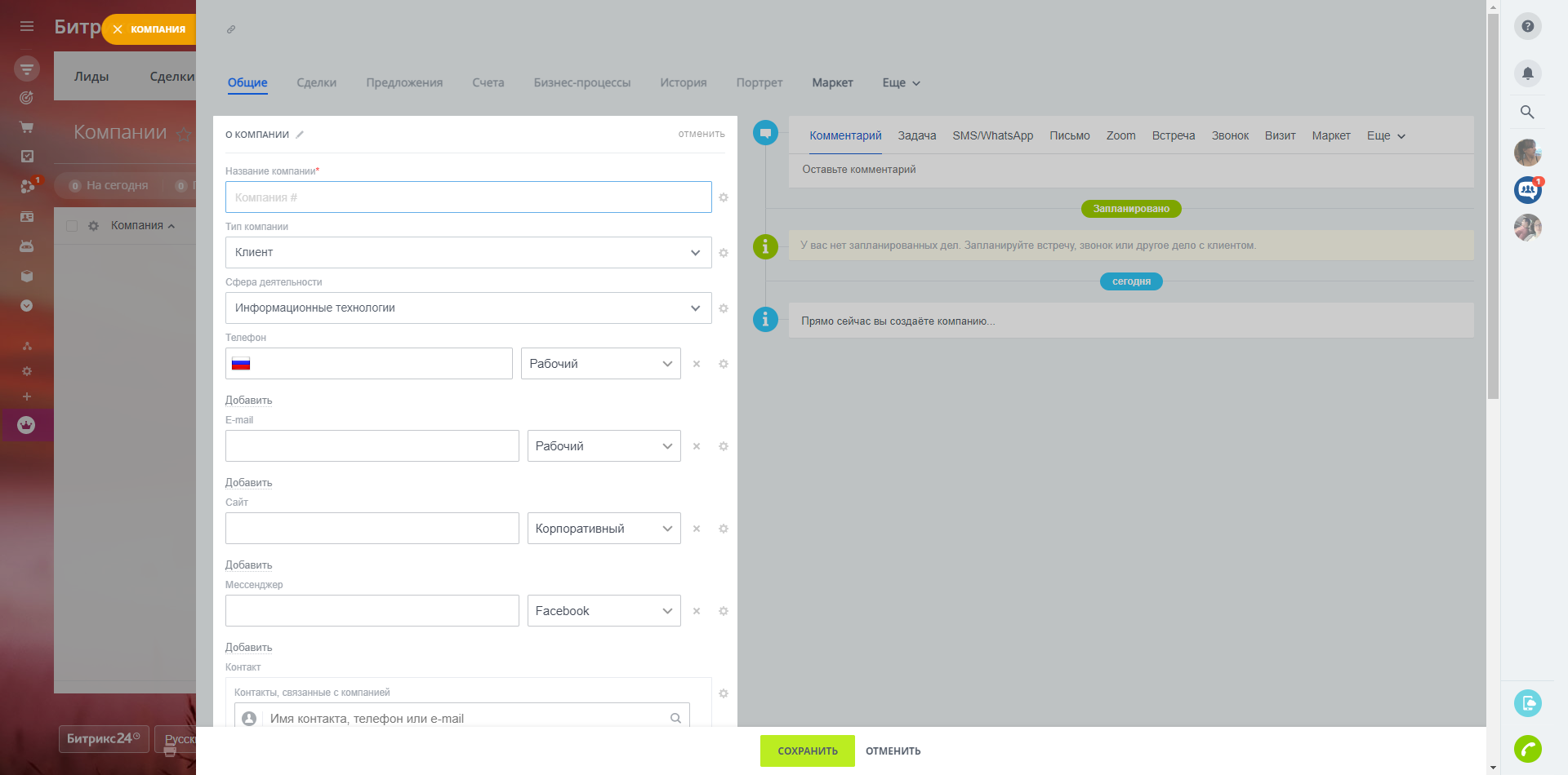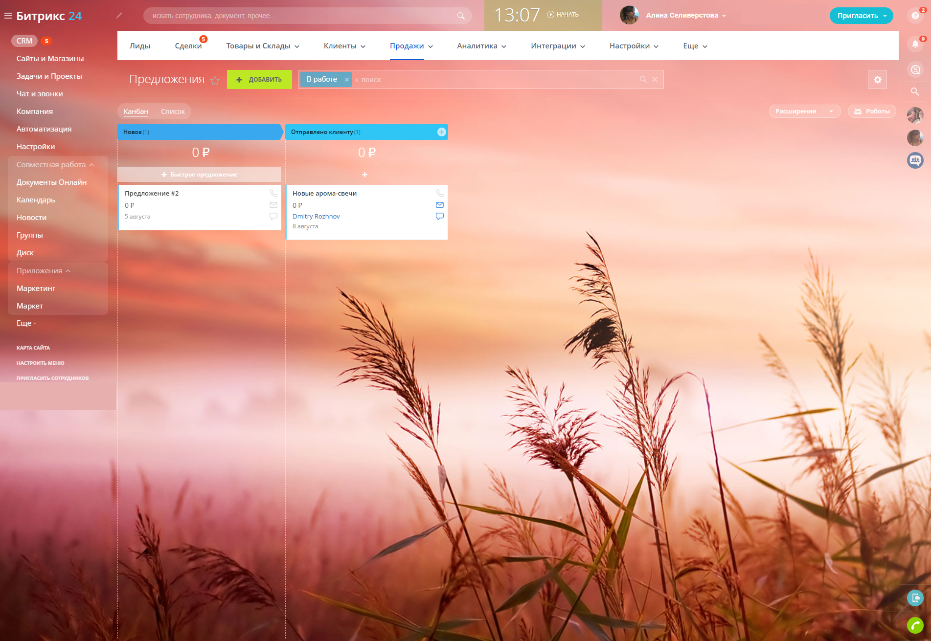 Обработка лида осуществляется на стадии “В работе”, менеджер связывается с клиентов и заполняет карточку, после чего он может конвертировать его в сделку и продолжать работать с ней в направлении “Продажа”.